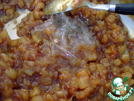 Растворить отжатый желатин в 25 гр горячей воды t=80*C. Ввести в еще горячую карамель. Остудить. Карамель должна быть еще теплой, но не горячей.
