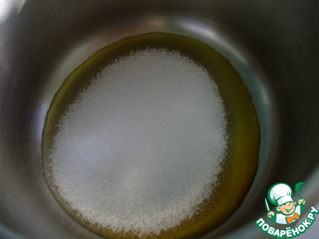 В большую кастрюлю насыпьте половину (около 50 граммов) сахара. Поставить на огонь и дождаться, когда он начнет таять. Добавить вторую половину и полностью карамелизовать сахар. Мешать нельзя, можно лишь время от времени потряхивать кастрюльку, чтобы сахар ровно распределился по поверхности.