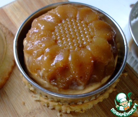 На застывшие карамельные яблоки вылить карамельный мусс, сверху, как крышечкой накрыть кружочком песочного теста. Я надеялась сделать украшения по бортикам пирожного, поэтому вырезала круги слишком большого размера, но... с украшательством у меня туго))) - времени обычно не хватает (. Потому мне пришлось подогнать песочные диски по размеру пирожного. Оставить на несколько часов в холодильнике.