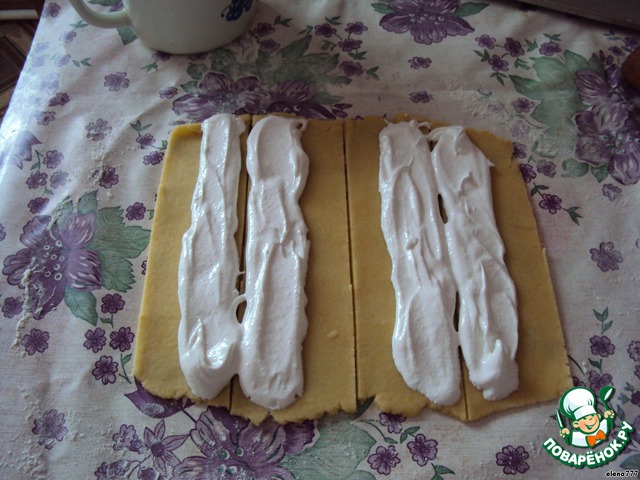 Разрезать пласт на полоски шириной 4-5 см. На край каждой полоски выложить крем.