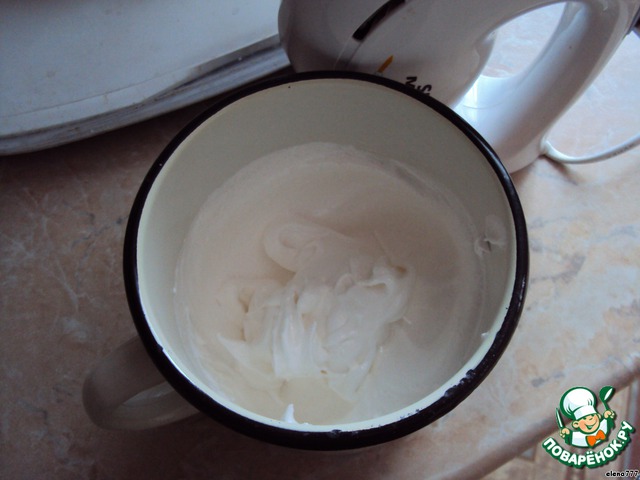 Приготовить крем: белки взбить миксером в пышную пену, постепенно подсыпать сахар 1 стакан, не переставая взбивать.