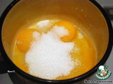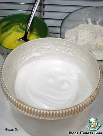3 яичных желтка отложить для крема. 8 белков комнатной температуры взбить в сухой посуде с щепоткой соли. Постепенно добавить оставшийся сахар (3/4 стак.) и взбивать до устойчивых пиков.
