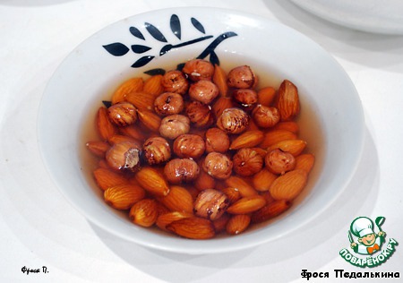 Орехи очистить. Залить кипятком на 2 минуты, воду слить и налить кияток еще раз, оставить на 10 минут. Спасибо belochke за совет! Так их чистить намного легче! Миндаль сдался, а вот фундук пришлось немного об сито потереть.