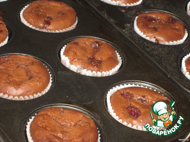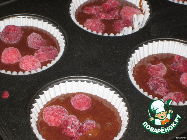 Выложить в формочки теста на 2/3 объема, затем сверху положить несколько штук замороженных или свежих ягод, а затем, ягоды либо вдавить, либо сверху залить еще небольшим количеством теста.