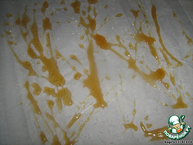 Ложкой выливаем карамель тонкой струйкой на пергамент, стараясь придать ей форму сосулек.