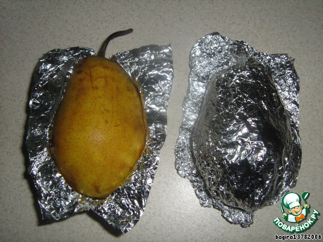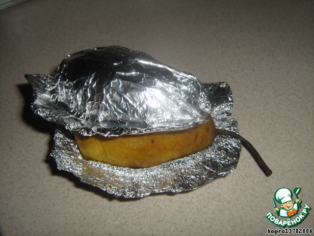 Из фольги отрезаем кусок, складываем в 3-4 слоя, формируем квадрат, по размеру больший, чем груша.