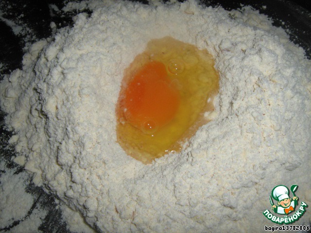 Из полученной крошки формируем колодец, в центр которого выпускаем яйцо и вино (или холодную воду) и быстро замешиваем тесто.