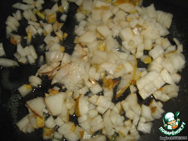 Теперь займемся начинкой: грушу (не снимая кожуры) тонко и мелко нарезаем.