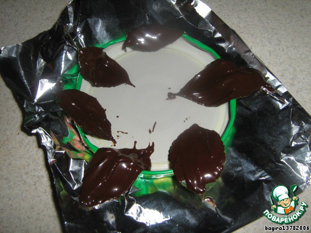 Итак, растапливаем небольшое количество шоколада, обмакиваем в него листочки, выкладываем их на неровную поверхность (для большей естественности) и убираем в холодильник для застывания шоколада.