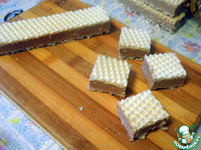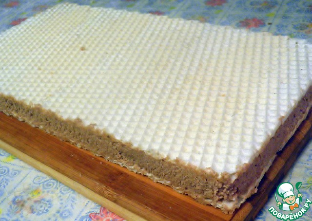 Полученную массу наносим толстым слоем, примерно 2 см, на один из вафельных коржей и разравниваем.