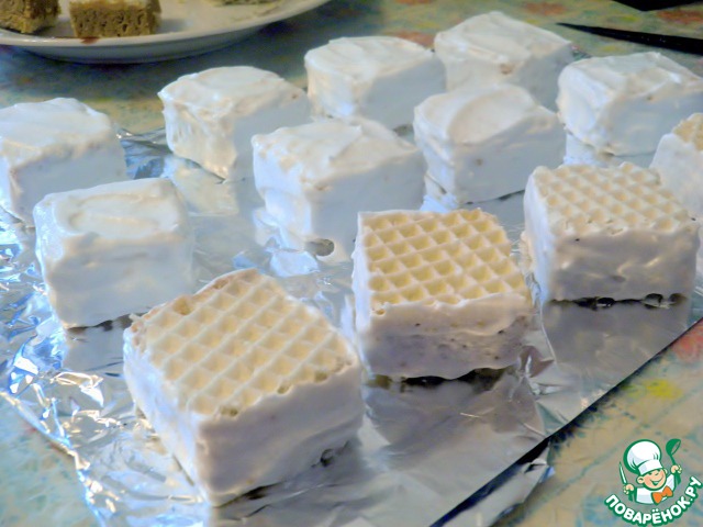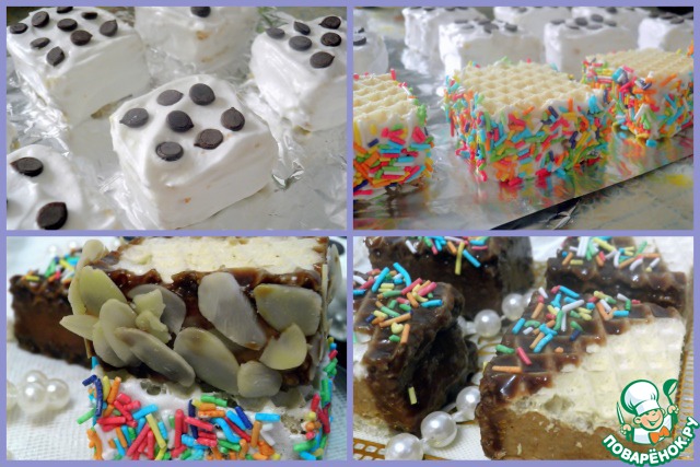 Описание получилось долгим, но готовятся пирожные практически мгновенно и между делом. А вот съедаются очень быстро. Причем тут у каждого члена моей семьи нашлись свои предпочтения. Сынишке по душе были полностью шоколадные с кондитерской посыпкой, дочурке - с белковой глазурью во всех видах, мне больше понравилось частичное украшение шоколадом, а мужу, как ни странно, минимальный вариант - без ничего. Отличаются они не только по внешнему виду, но и по вкусу, и по ощущениям. Белковая глазурь размягчает вафельный слой, поэтому пирожные с ней очень мягкие и нежные. А вот покрытые шоколадом или без покрытия сохраняют хрустящий вафельный слой, а в компании с нежным масляно-ореховым внутреним слоем - это просто блаженство.