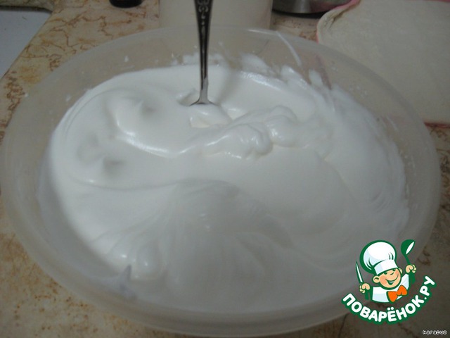 Пока тесто выпекалось, взбила белки с сахаром в крепкую пену. Чтобы ложка стояла! :-)