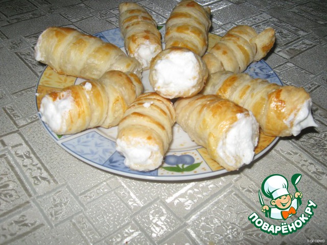 Когда трубочки подрумянились, вытаскиваем их из духовки, остужаем, начиняем белковым кремом.