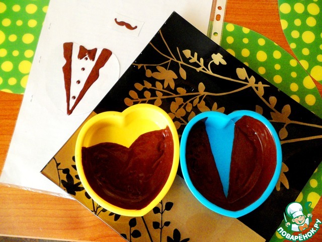 Растопить черный шоколад на водяной бане, нарисовать внутри формочек им декольтированное платье и фрак. На отдельном листе нарисовать лацканы фрака, бабочку, пуговицы и усы и аккуратно, при помощи бумажного контика поверх файла, обвести рисунки шоколадом.