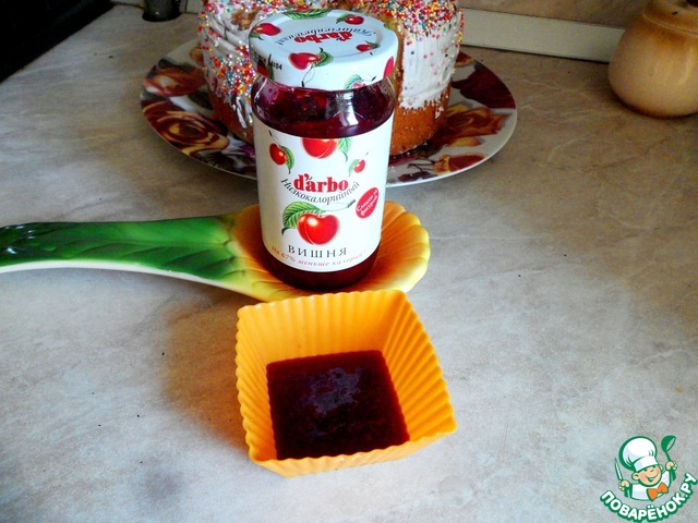 Замочить 1/3ч. л. желатина в 1ст. л. холодной воды на 10 минут. Добавить 1ст. л. протертого через сито вишневого конфитюра D’arbo. Нагреть на водяной бане и вылить в силиконовую форму. Убрать в холодильник для застывания.