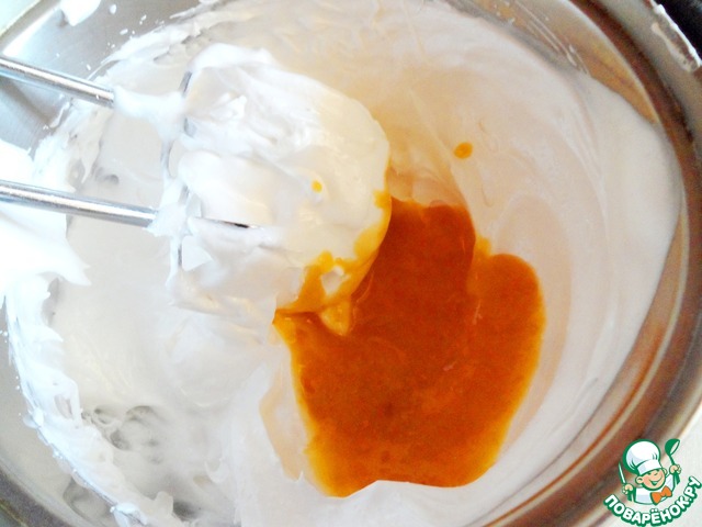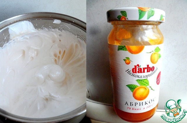 Далее готовим суфле. Воду с сахаром доводим до кипения и варим 10-15 минут, пока не начнет сироп пузыриться, но следить, чтобы не начал желтеть. Пока варится сироп взбить белки с лимонным соком. Когда сироп будет готов, тонкой струйкой вливаем сироп в белки, при этом непрерывно взбивая, пока масса не начнет остывать. Далее добавляем 4ст. л. абрикосового конфитюра D’arbo и опять все взбить.