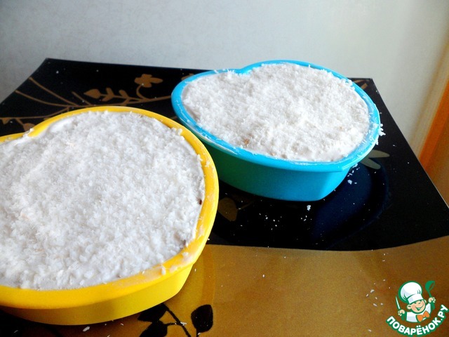 Достаем наши формочки с шоколадом и заполняем их белковым суфле, сверху присыпаем кокосовой стружкой. Убираем в холодильник для застывания на 3 часа.
