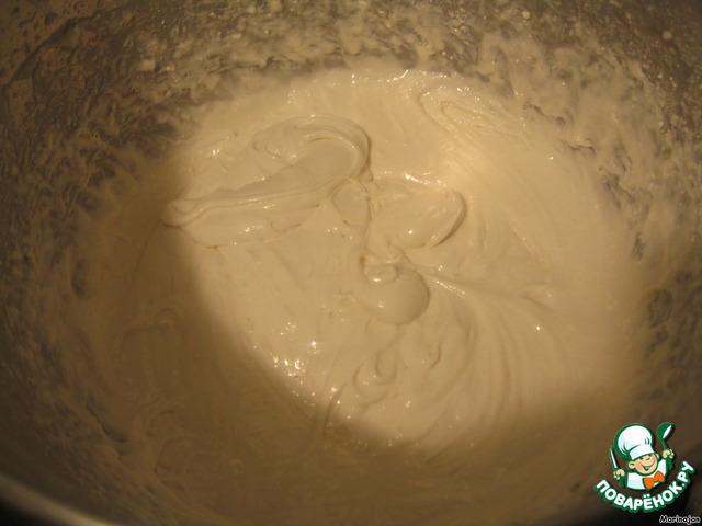 Тесто: взбиваем белки, добавляем сахар, далее по одному желтки и растительное масло, муку с крахмалом просеиваем и размешиваем лопаточкой