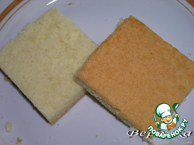 1. Остывший корж разрезать на квадратики или прямоугольнички.