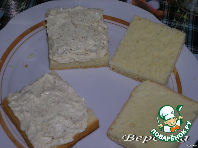 3. Смазать один коржик столовй ложкой крема и накрыть вторым.