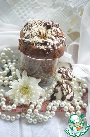 Добавляем растительное масло и хорошо перемешиваем. Из творога скатать 2 шарика, обвалять их в кокосовой стружке. Выложить в стакан (кружку) 1 ст. л теста, положить творожный шарик, затем снова тесто и наверх 2й творожный шарик. Стакан предварительно смазать тонким слоем масла Бортики у формы должны быть не очень низкие, т. к. бисквит в процессе готовки увеличивается в два раза.