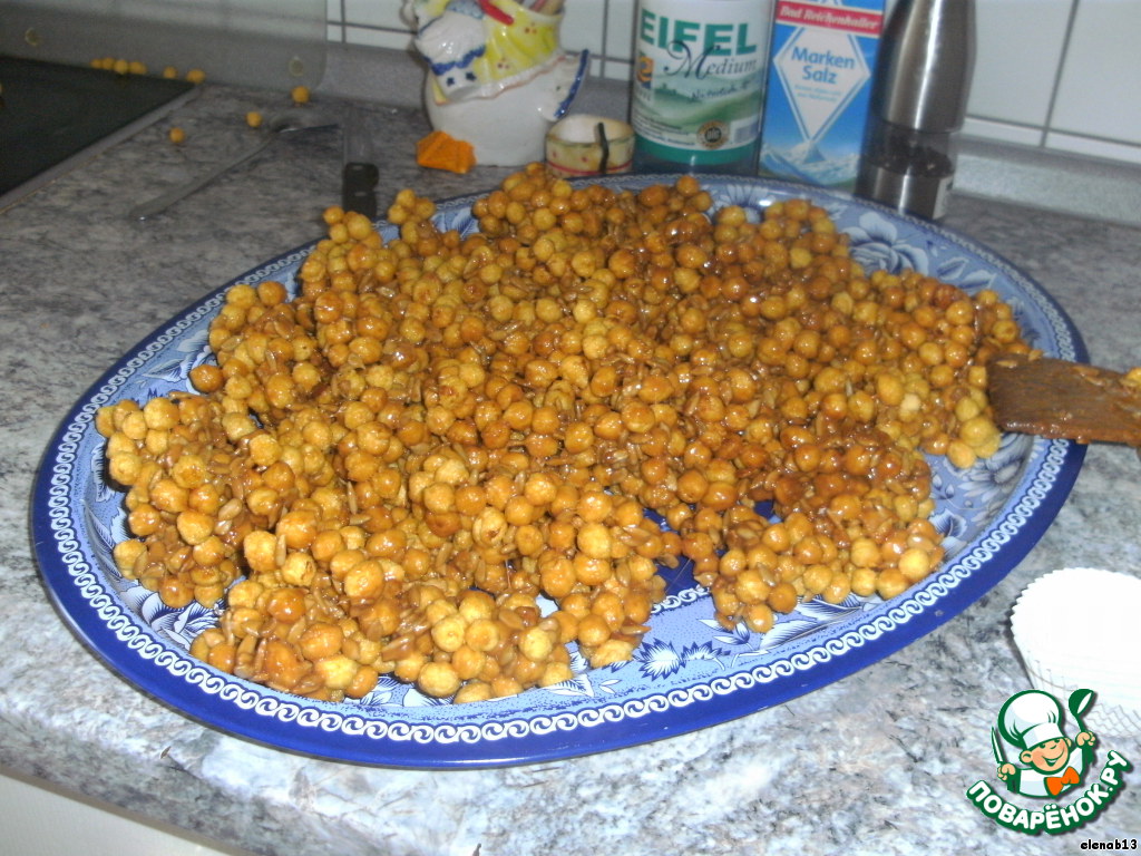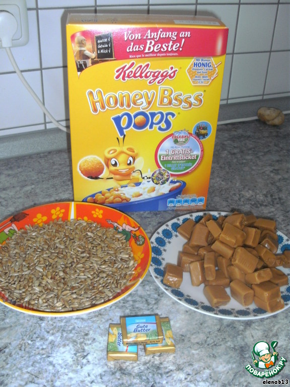 Добавить жареные зёрнышки, перемешать и всыпать шарики - все БЫСТРО перемешиваем (т.к. ирис быстро застывает)...