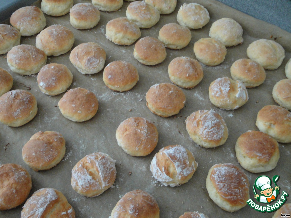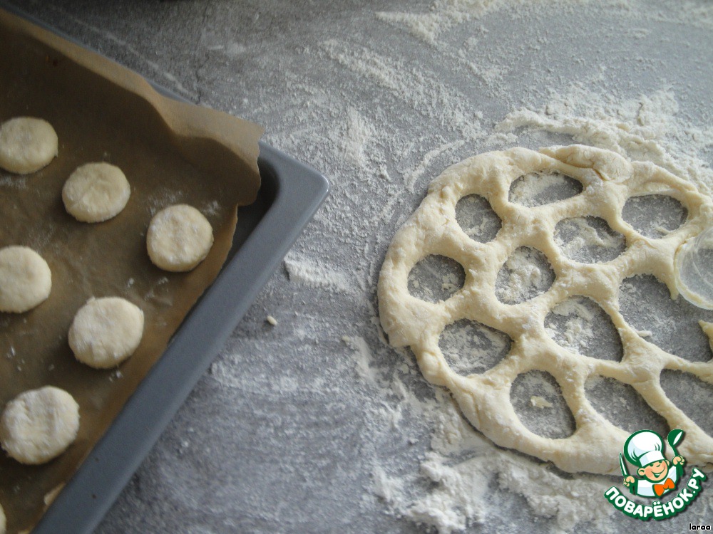 Стол присыпать мукой и раскатать тесто толшиной 1 см. Вырезать кружочки диаметром 3см. Противень выложить пергаментом и уложить на него творожные пирожные.