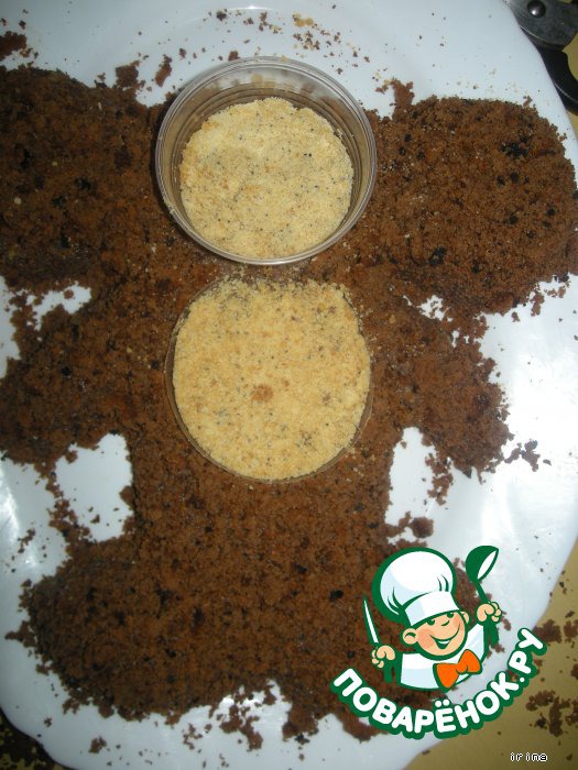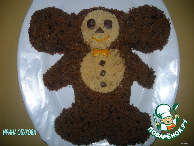 Руками, вылепить из нескольких частей Чебурашку, всего посыпать крошками от коржа, грудка и мордочка из печенья. Дать постоять в холодильнике несколько часов!