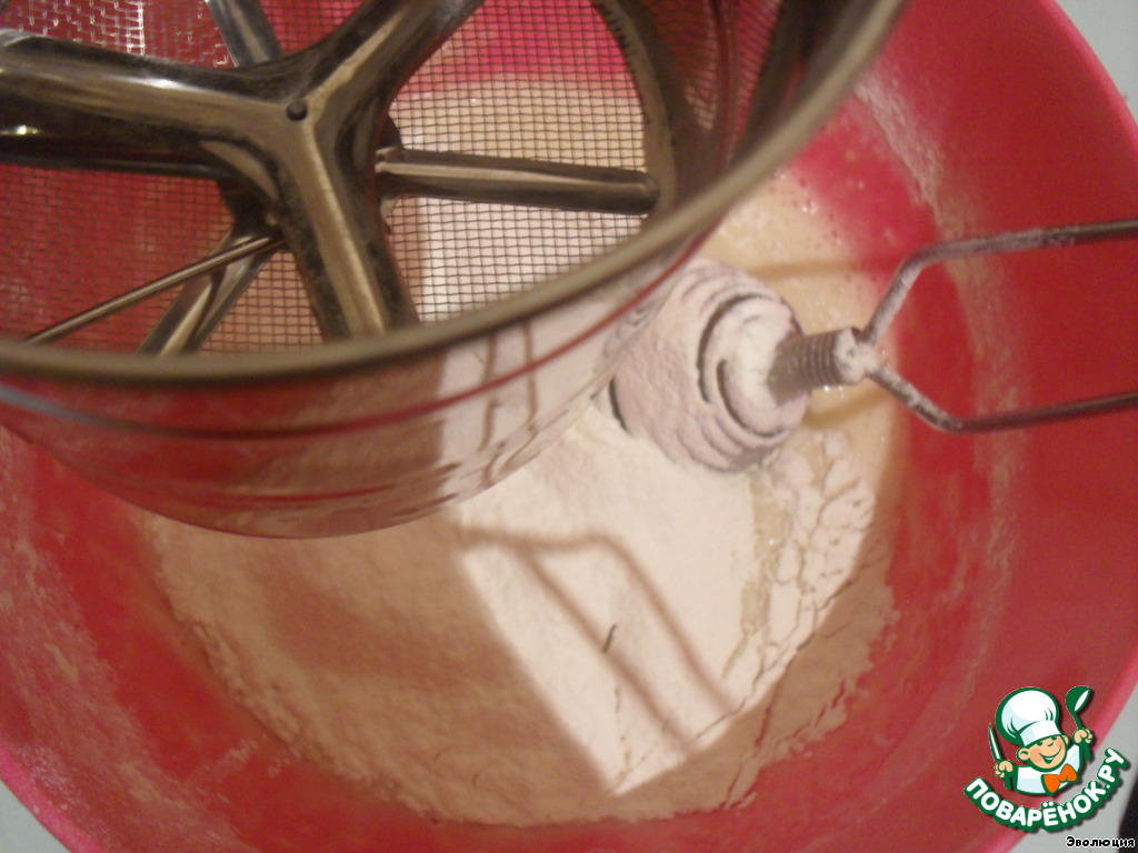 Добавить к яйцам ванилин и просеять туда же муку с разрыхлителем. Тщательно перемешать.