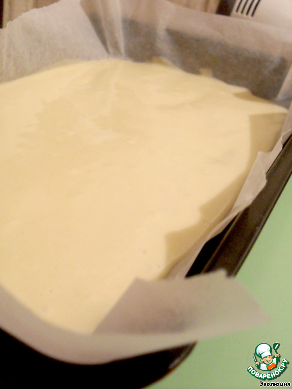 Форму выстилаем бумагой для выпечки и выкладываем в форму тесто – густое, стекающее с ложки. Разравниваем и ставим в духовку, разогретую до 200С. Выпекаем до золотистого цвета.