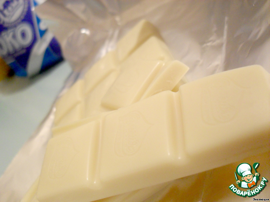 Тем временем готовим вкусный крем из белого шоколада. Ломаем плитку на кусочки.
