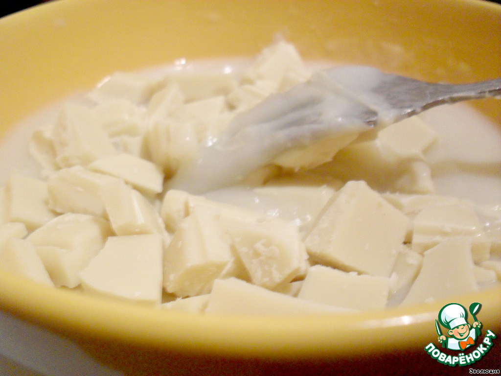 В горячую молочную смесь добавляем кусочки белого шоколада и мешаем до полного растворения шоколада. Полностью остужаем.