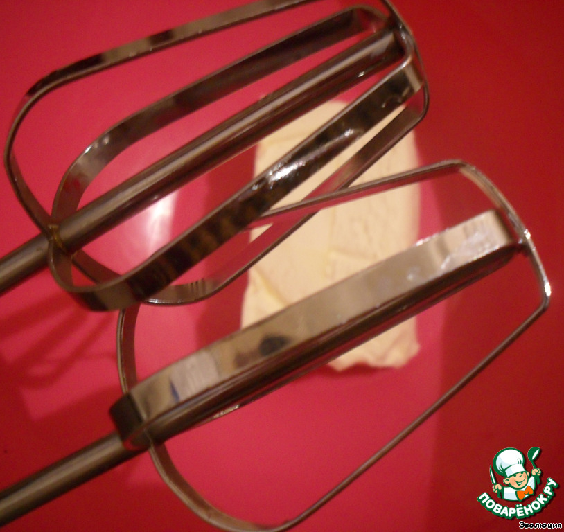 Сливочное масло взбиваем до пышности и посветления. Постепенно добавляем в него шоколадную массу. Взбиваем до однородности.