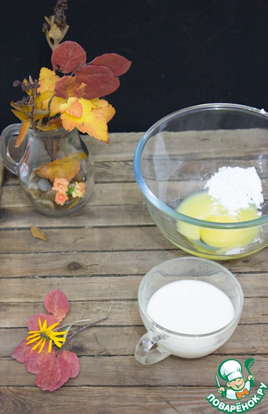 Желтки размешать с пудрой, влить в кастрюльку и добавить молоко.