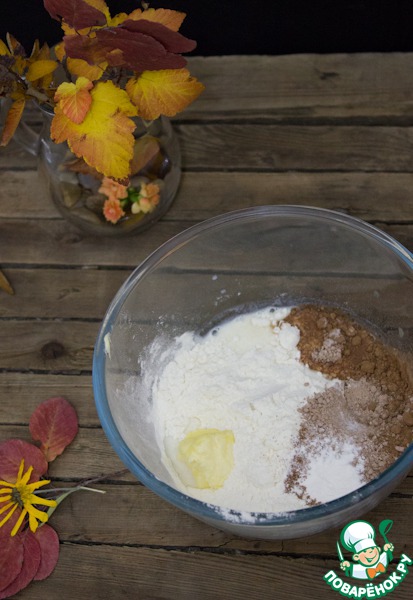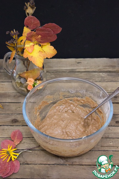 Смешиваем в миске: целое яйцо, муку, какао, размягченное масло, молоко, разрыхлитель, ванилин и соль. Получиться довольно густое тесто, при необходимости добавить пару ложек молока, тесто густое, тягучее, почти не растекается.