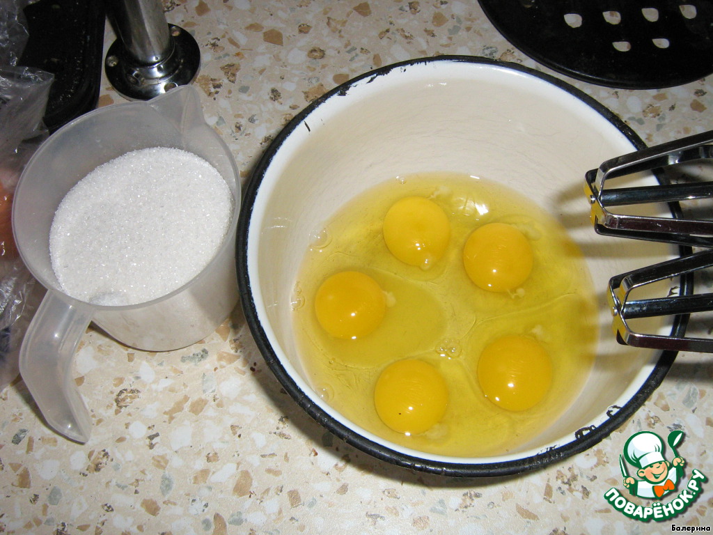 Яйца взбить с сахаром в пышную пену.