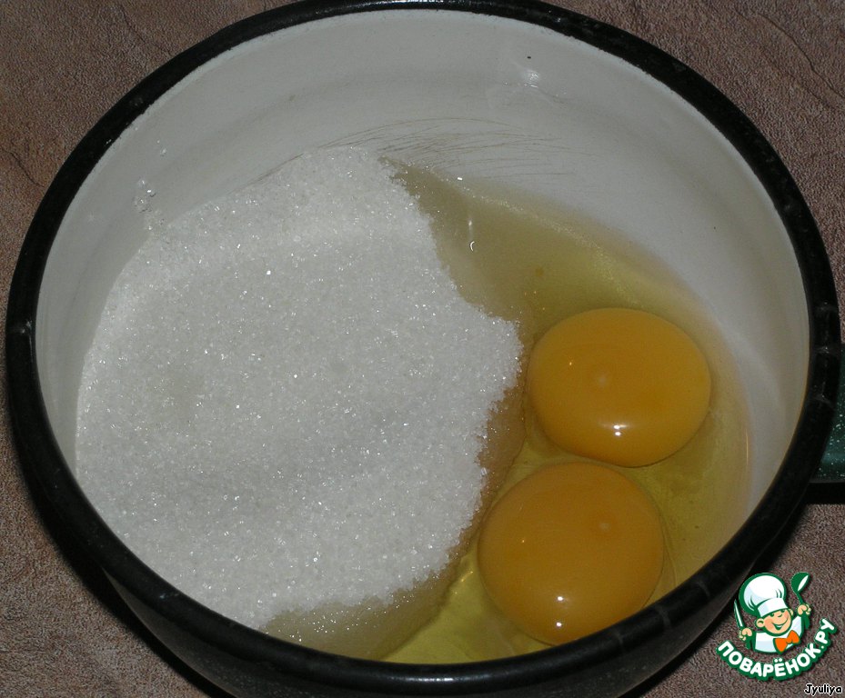 Тесто: яйца смешать с сахаром, добавить растопленное сливочное масло, перемешать.