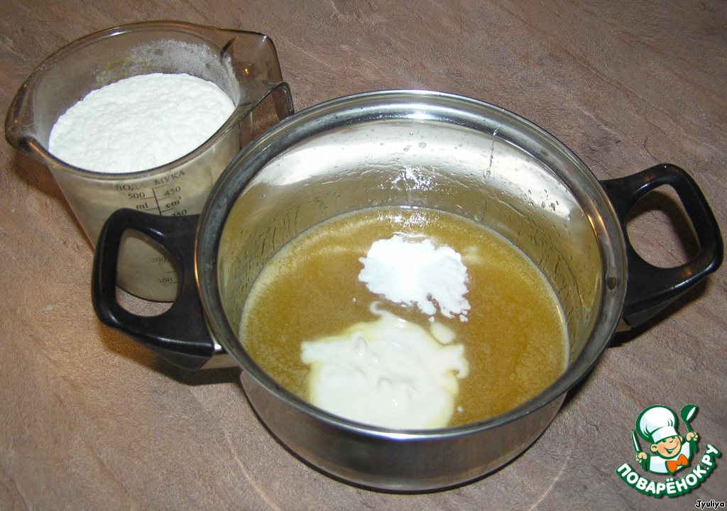 Немного остудить, добавить мед, сметану, соду, муку, замесить тесто.
