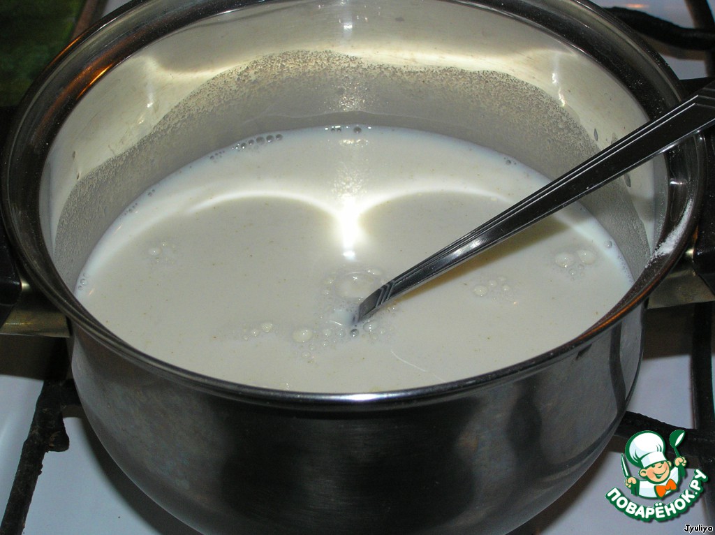 Сварить заварной крем: сахар смешать с мукой, добавить молоко. Нагреть до загустения, остудить.