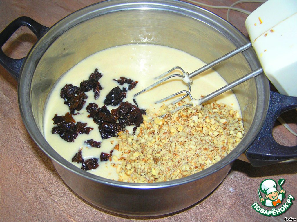 Чернослив нарезать, орехи измельчить. Добавить в крем, перемешать.