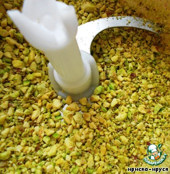 Пока бисквит печется, приготовим фисташки. Если они у вас не чищенные, то, естественно, почистить. Измельчить блендером, но не в пыль! ;)