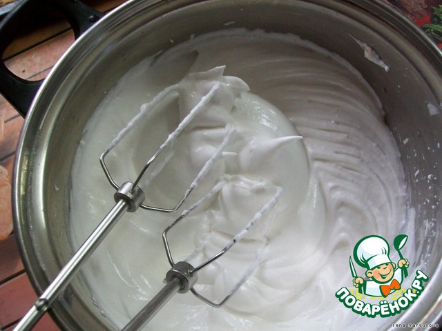 Белки взбить, постепенно добавляя оставшиеся 0,75 стак. сахара. В конце взбивания добавить лимонный сок и пакетик ванильного сахара. Впрочем, если белки хорошо взбиты, можно обойтись и без сока.
