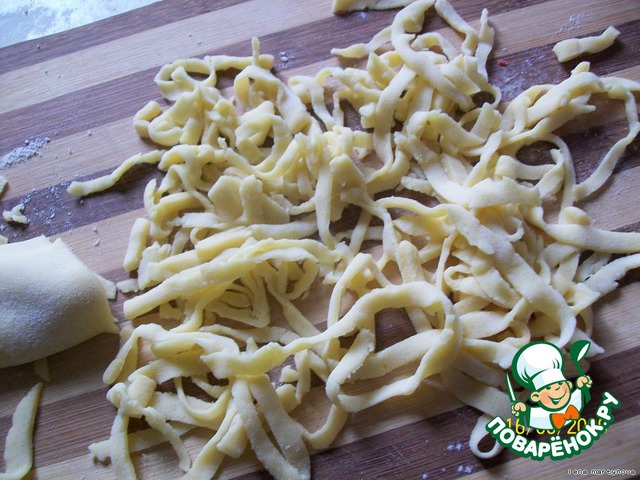 Тесто тонко раскатать, посыпать мукой, свернуть рулетом и нарезать лапшой.