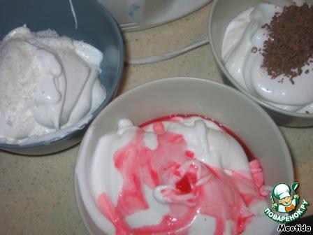 в одну добавляем кокосовую стружку, в другую - клубничный сироп, в третью - тертый шоколад