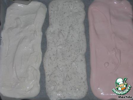 Противень застилаем бумагой для выпекания, выкладываем три вида безе и отправляем в разогретую до 130С духовку на 1,5 часа, после этого духовку выключаем, а безе оставляем в ней до полного остывания