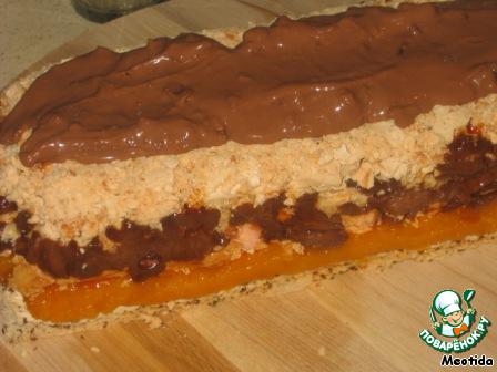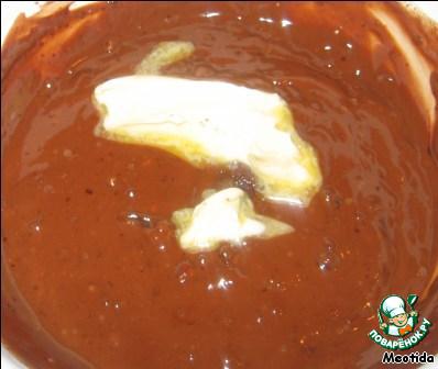 Переворачиваем готовый торт-пирожное и сверху равномерно поливаем оставшимся шоколадным кремом, ставим в шолодильник, чтобы крем слегка затвердел.