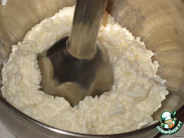 Горячую рисовую кашу переложить в подходящую посуду и перемолоть блендером в однородную массу.