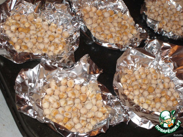 Духовку разогреваем до 180-200 градусов. Заранее готовим горох (фасоль или другие бобовые) и фольгу (пергаментную бумагу)
