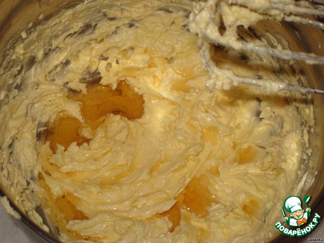 Размягченное масло взбить с медом и сахаром в легкий крем (взбивать 4-6 минут).