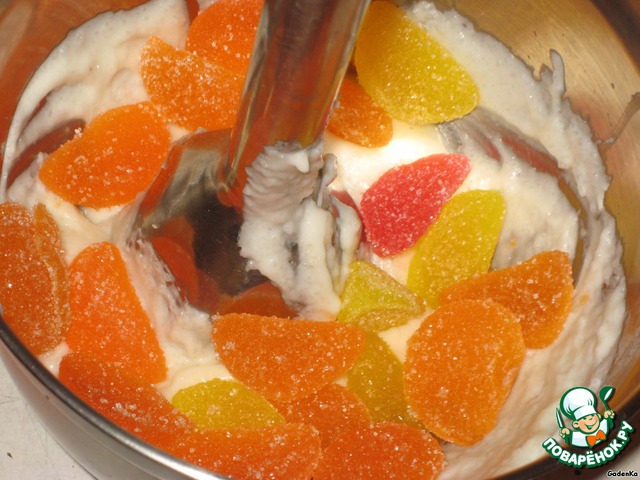 Затем от рисовой массы отложить чуть меньше половины в отдельную емкость, а к остальной добавить мармелад и уже вместе с мармеладом опять перемолоть.